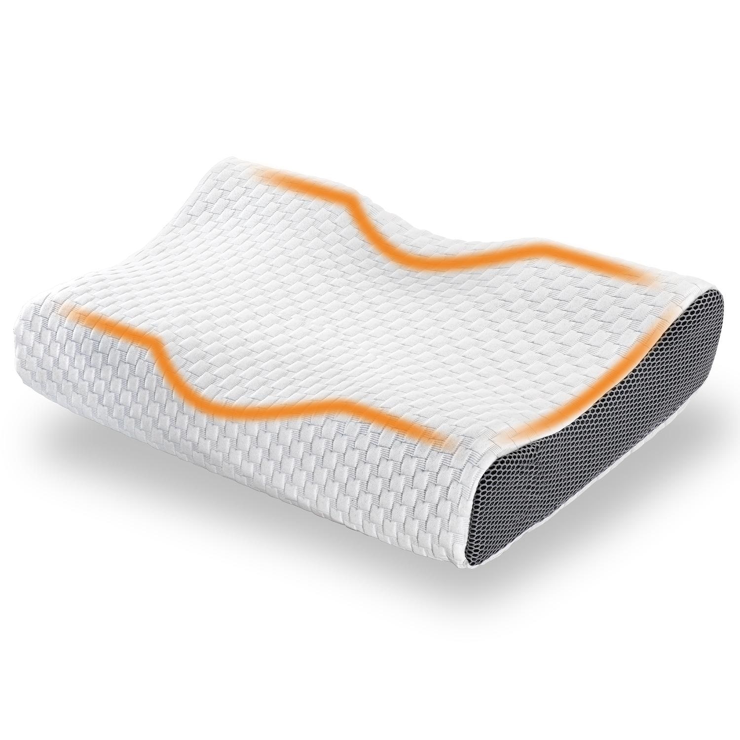 Ergonomisches Gel-Effekt Nackenstützkissen (32 x 60 cm) mit stützend gestalteten Einschnitten für eine natürliche Schlafposition von Kopf und Schulter. Es beugt effektiv dem Schnarchen vor, kann die Schultermuskulatur entlasten und schützt die Halswirbelsäule vor Fehlstellungen. Das Kissen bietet verschiedene Nackenstützbereiche und eine Höhenregulierung durch eine separate Schaumplatte, die für alle Schlafpositionen geeignet ist. Die Kombination aus Kaltschaum und Viskoelastikschaum sorgt für optimalen Feuchtigkeitsaustausch und ein angenehm weiches Liegegefühl. Der abnehmbare Bezug ist bei 60°C waschbar, hautsympathisch und für Allergiker geeignet. Öko-Tex zertifiziert, hergestellt in der EU.