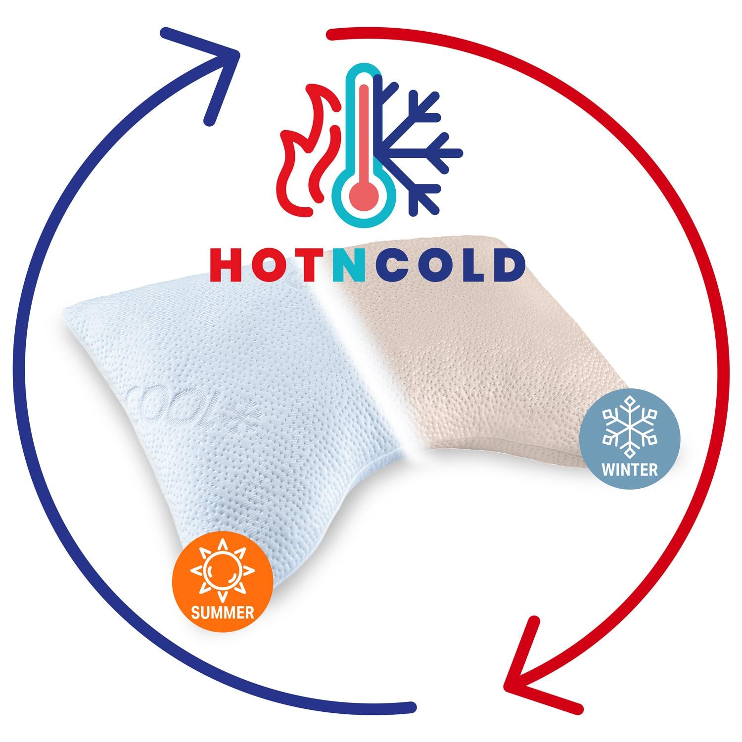 Reversible cushion with cooling summer side & warming winter side for year-round sleeping comfort